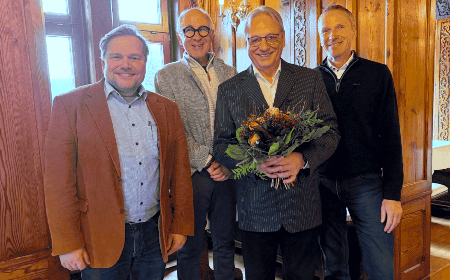 Die Vorstände Matt􏰂hias Bohn und Thomas Kelz dankten Michael Schade im Rahmen der Feier persönlich für seine langjährige und engagierte Arbeit. Sie wünschten ihm – ebenso wie den weiteren vier ausgeschiedenen Kolleg*innen – alles Gute, Gesundheit und viele erfüllende Momente im neuen Lebensabschni􏰂tt im Kreis der Familien.